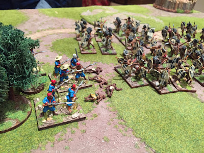 This very simply allows for all manner of ways to deal with troop concentration on the table top quite elegantly. In fact it is quite reasonable to play DitDC without using bases at all as long as you note that a certain number of figures (usually 3) counts as a base and the unit facing is maintained throughout play, which is usually the case anyway. We didn’t try this as you can see but others have and I think this is worth a go to make the game look a little more dioramic throughout play, certainly for two base wazungu (white men) units it is easy to manage. Chris goes into some detail on this in his introduction, spelling out his thoughts for DitDC and it is perhaps interesting to read to understand the focus of the game...